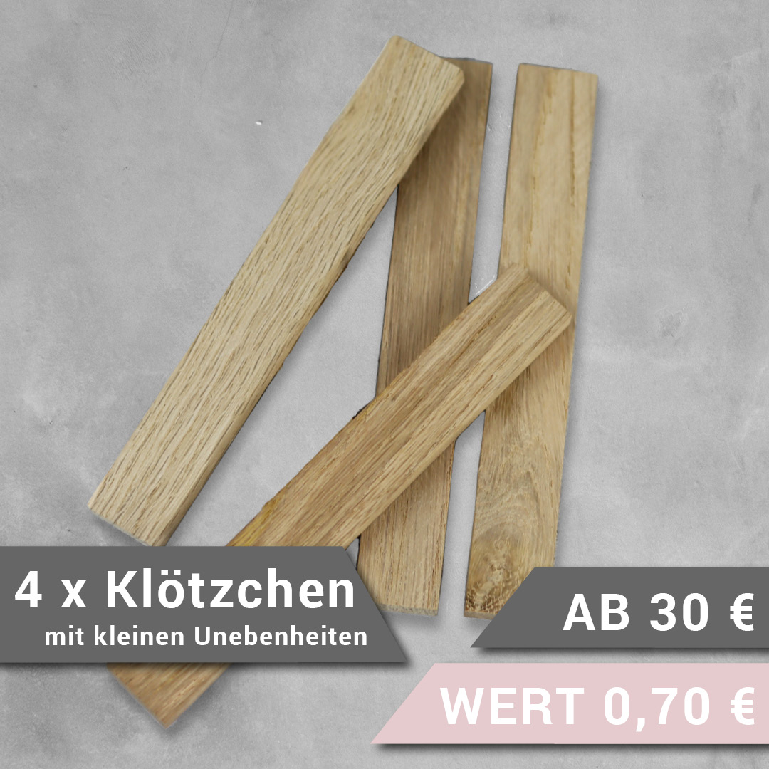 Als kreativGoodie erhältst Du jetzt vier Klötzchen mit kleinen Unebenheiten, Astlöchern oder minimalen Absplitterungen.